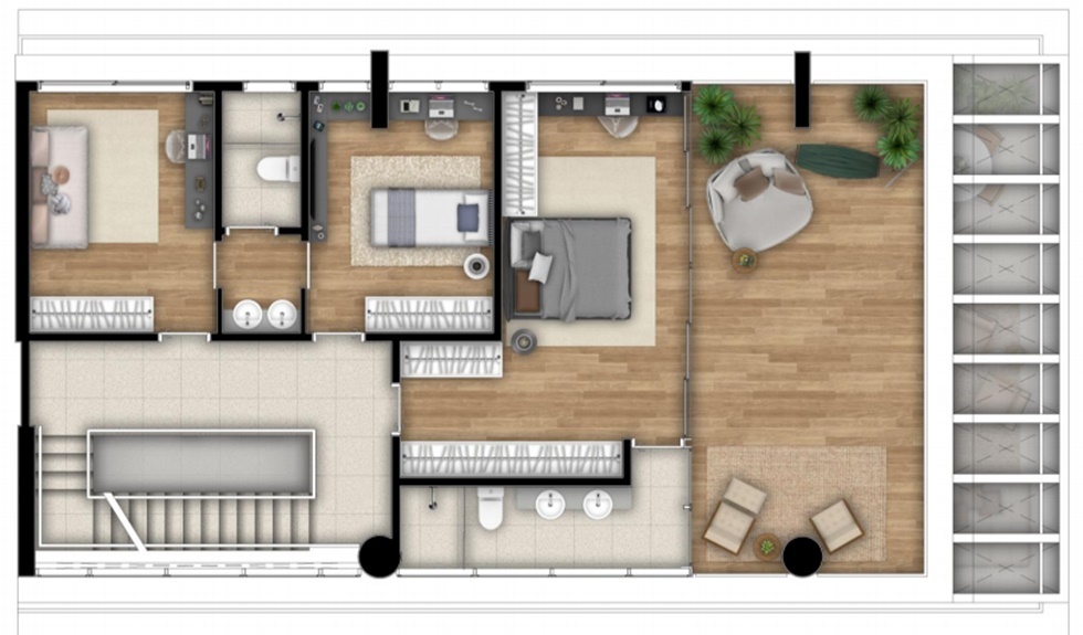 PAVIMENTO 2: 1 SUÍTE (MÁSTER COM CLOSET E TERRAÇO) E 2 DORMITÓRIOS COM SUITE AMERICANA