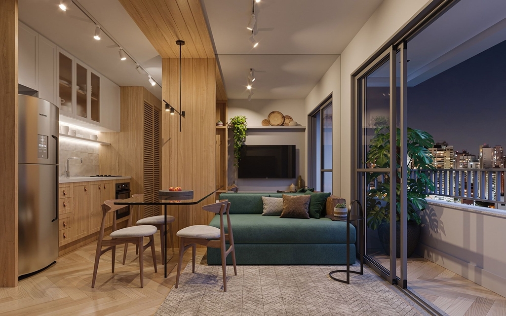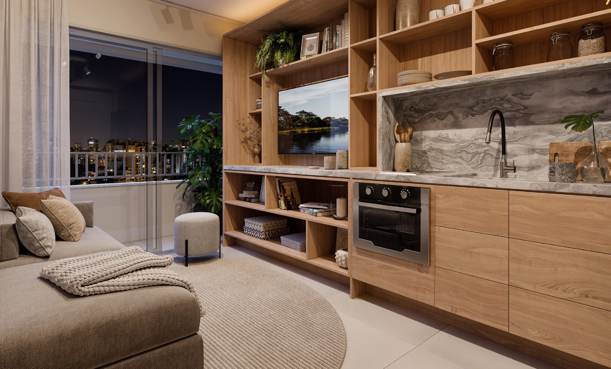 PERSPECTIVA ILUSTRADA DO LIVING DO APARTAMENTO DE 39 M2