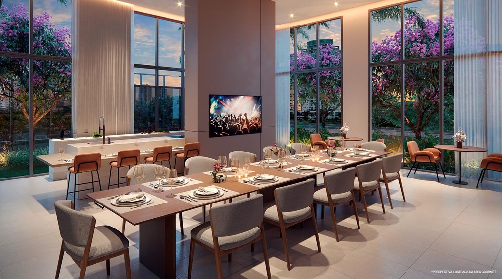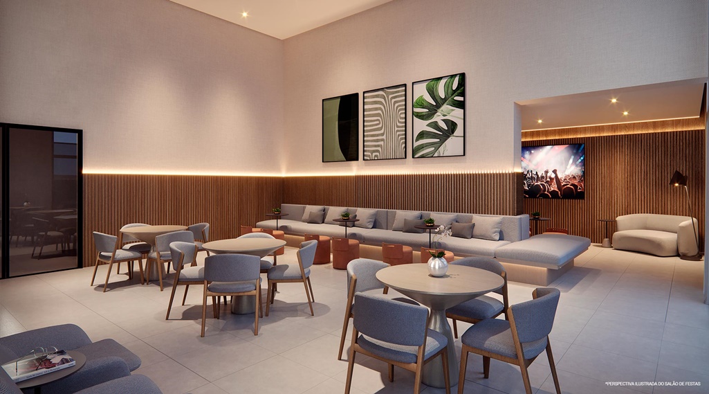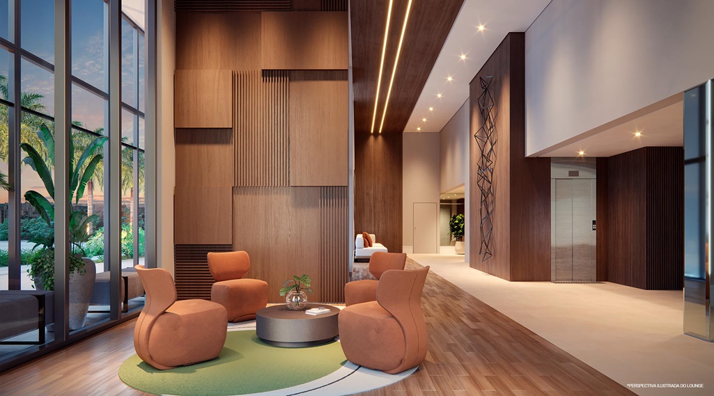 LOUNGE FEITO PARA IMPRESSIONAR. A ARQUITETURA, DECORAÇÃO E O PÉ-DIREITO ELEVADO ENGRANDECEM AINDA MAIS O HALL DE ENTRADA.