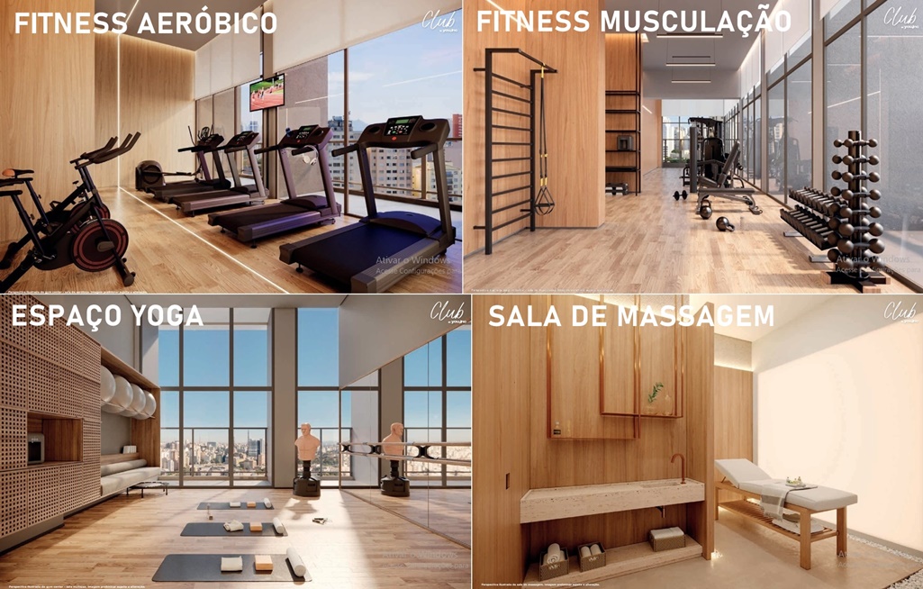 ESPAÇO FITNESS DIVIDIDO EM 3 AMBIENTES (AERÓBICO, MUSCULAÇÃO E ESPAÇO YOGA) + SALA DE MASSAGEM