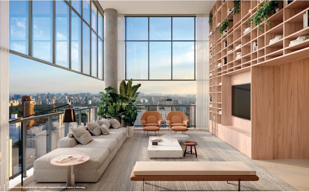 LIVING COM PÉ DIREITO DE 5,60 PARA DAR AMPLITUDE AO SEU AMBIENTE, COM SUGESTÃO DE DECORAÇÃO