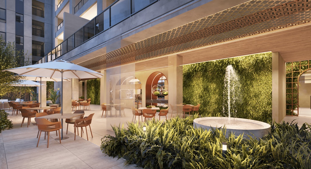 PÁTIO COM ESPELHO D´ÁGUA E LAREIRAS